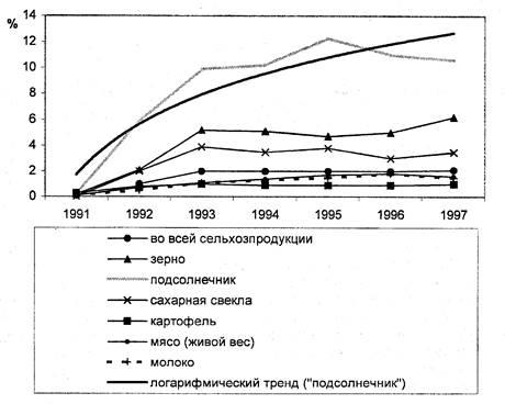 Как было показано в предыдущей главе, обеспеченность фермера землей носит вполне виртуальный характер. Он может пользоваться ею лишь для извлечения прибыли, но не как источником собственных средств. Соответственно, фермер в России - не совсем фермер, он скорее арендатор, временщик. Обратим внимание на то, что фермеры активно выходят на рынок с такой продукцией, как подсолнечник и зерно (см. рис. 15). Именно эти культуры пользуются наиболее высоким спросом на рынке. В условиях отсутствия реальной стоимости земли, фермер стремится извлечь быструю прибьшь, не соблюдая севообороты, используя одну и туже культуру часто 5-6 лет подряд на одном поле. Проблема деградации почв на участке волнует хозяина не сильно: в условиях неопределенности строить прогноз на дальнейшее развитие своего бизнеса не приходится. Таким образом, вывод, сделанный в предыдущей главе, подтверждается: именно дефицит земли, выступающий в данном случае в виде нереализованных прав на нее (она есть, но ее как бы нет) и является причиной неустойчивости фермерских хозяйств.