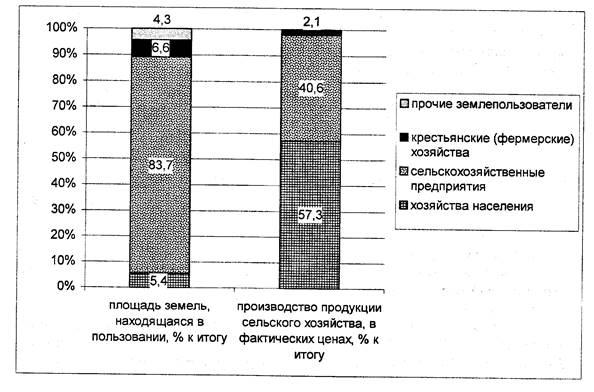 Дело в том, что именно земля (и только) может быть основой успешной деятельности фермера в условиях рынка. Если городской житель может начать свое дело, заложив квартиру и получив кредит, то для фермера эта возможность официально исключена - даже не по причине отсутствия законодательства об ипотеке, а просто потому, что в стране отсутствует развитый земельный рынок, связанный с рынком капитала. Высокое соотношение доли занимаемой земли и доли фермерской продукции, как это видно на рис. 2 (у фермеров - 3; у колхозов - 2; у хозяйств населения - 0,1) - результат кризисного состояния фермерских хозяйств, испытывающих острую нехватку основных средств и долгосрочных кредитов. В этих условиях фермеры не способны эффективно использовать даже те небольшие наделы, которые у них есть. Поэтому в отношении фермера следует говорить не о дефиците земли, а о невозможность использовать ее в полном экономическом смысле: как способ получить и урожай и как источник собственных средств.