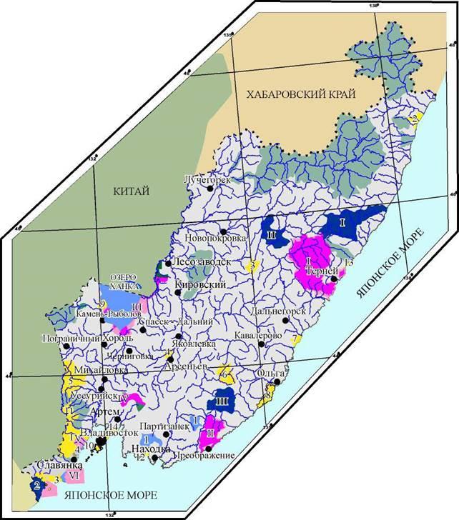 Границы заповедника на значительном протяжении выходят к широким речным долинам. Здесь, особенно в приустьевых участках, большие площади занимают луга, травяные болота, поля, которым сопутствуют зарос ли кустарников и перелески. Тихие водоемы по нижнему течению рек населяет черно-пятнистая лягушка из группы зеленых лягушек, вообще тесно связанных с водоемами. Многочисленны в лесолуговом ландшафте дальневосточная лягушка из группы бурых лягушек, обыкновенная и монгольская жабы, дальневосточная жерлянка, Жерлянки, обитающие на приустьевых болотах р. Киевки, отличаются от живущих за пределами приморской полосы особенно яркой красной окраской нижней поверхности тела и мелкими размерами. Преимущественно на лугах держится тигровый уж, преследующий главным образом лягушек, и узорчатый полоз. Амфибии преобладают также в составе пищевого рациона обычного здесь восточного щитомордника. Близкий вид - каменистый щитомордник предпочитает леса на склонах гор. Кроме щитомордников, других ядовитых змей в заповедниках Южного Приморья нет. Из неядовитых змей тут изредка встречается красноспинный полоз, в лесные массивы не проникающий вообще Обычен амурский полоз, придерживающийся перелесков.