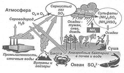 , которая в свою очередь быстро окисляется и превращается в серную кислоту. Поэтому, попав в облака, где всегда присутствует аммиак, щелочные или щелочноземельные металлы, сера быстро переходит снова в сульфатную форму и вместе с дождем или снегом выпадает из облаков на землю.