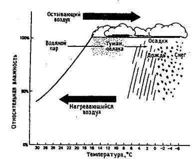 Рис. 1.1. Влияние температуры на относительную влажность воздуха (по Б.Небелу, 1993)