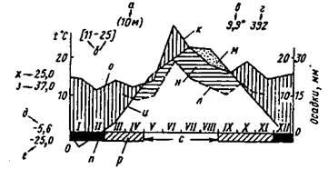 I— высота над уровнем моря, б — число лет наблюдений за температурой (первая цифра) и осадками (вторая цифра), в — средняя годовая температура, г — средняя годовая сумма осадков в мм, д—средний суточный минимум самого холодного месяца, е -•- абсолютный минимум, ж — средний суточный максимум самого теплого ыесяца, з — абсолютный максимум, и — кривая средних месячных температур, к — кривая средних месячных сумм осадков (соотношение Ю°=20 мм), л — то же (соотношение 10°=30 мм), м — засушливый период, н — полузасушливый период, о — влажное время года, п — месяцы со средним суточным минимумом температуры ниже 0°С, р — месяцы it абсолютным минимумом температуры ниже 0°С, с — безморозный [период. По оси абсцисс — месяцы.