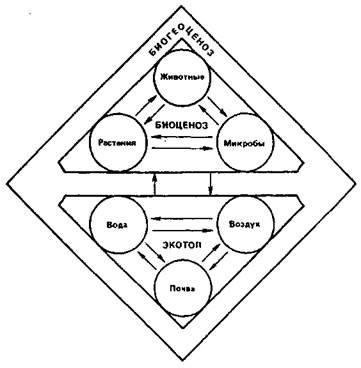 В современном понимании биогеоценоз (Б ГЦ) — эволюционно сложившаяся, относительно пространственно ограниченная, внутренне однородная природная система функционально взаимосвязанных живых организмов и окружающей их косной среды (рис. 2.1.). БГЦ характеризуется определенным энергетическим состоянием, типом и скоростью обмена веществом и информацией (Реймерс). Биогеоценоз — это элементарная биохорологическая единица биосферы — глобальной экологической системы. Совокупности однотипных БГЦ образуют ландшафты (регионы биосферы). Так, таежные БГЦ формируют таежный ландшафт, степные БГЦ — степной ландшафт и т. д.