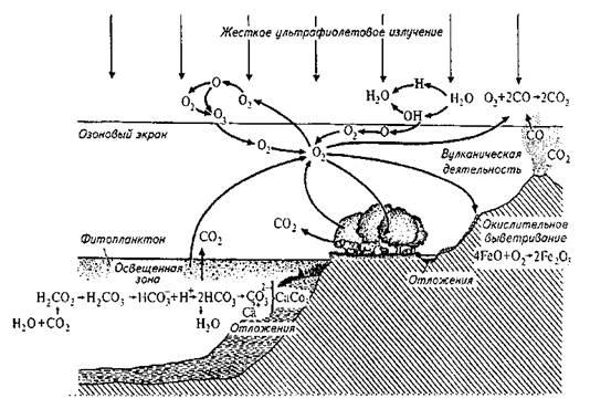 Рис. 4.4. Упрошенная схема некоторых путей круговорота кислорода на Земле (Клауд, Джибор, 1972)