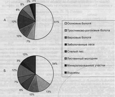 Рис. 2. Распределение площади (А) и числа разливов нефти (Б) по биотопам на Мамонтовском месторождении