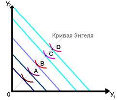 Сначала графически представим изменение спроса при изменении дохода. Пусть изменится доход М. Тогда произойдет параллельное смещение бюджетной прямой. С изменением дохода изменится и спрос. На каждой бюджетной прямой существуют такие точки, в которых максимизируется функция полезности (точки А, B, C, D). Линия AD - кривая доход-потребление, или кривая Энгеля. Она показывает, как при фиксированных ценах меняется объем потребления каждого из благ в зависимости от дохода. Рисунок 1 применим к случаю, когда ни один из товаров не является товаром Гиффина. Если же один из товаров - товар Гиффина, то кривая сместится в сторону качественного товара, а спрос на Гиффинский товар - упадет.