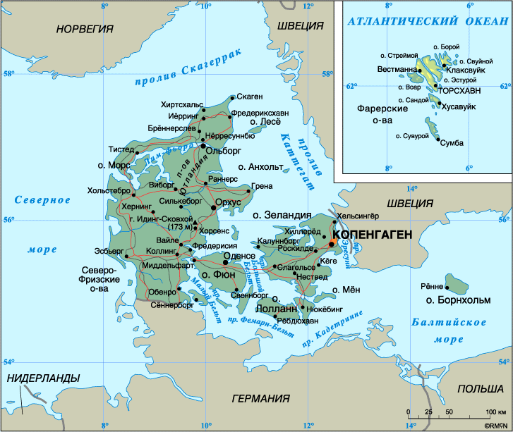 . Столица – Копенгаген. Население – 5 220 тыс. человек (1997). Плотность – 122 человека на 1 кв. км. Городское население – 85%, сельское – 15%. Площадь – 43 093 кв. км. Самая высокая точка – гора Идинг-Сковхой (173 м), самая низкая – 12 м ниже у.м. Государственный язык – датский. Основная религия – лютеранство. Административно-территориальное деление: 14 амтов и 2 самостоятельные городские коммуны (Копенгаген и Фредериксберг). Денежная единица: крона = 100 эре. Национальные праздники: День Конституции – 5 июня, День рождения королевы – 16 апреля. Государственный гимн: «Это прекрасная страна».