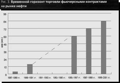 , насколько объективен переход от монопольного рынка к конкурентному, настолько же объективен переход к биржевому ценообразованию. Движущим механизмом биржевого ценообразования являются ожидания субъектов рыночных отношений, то есть фьючерсный рынок (рынок ожиданий). При этом доминирующими становятся цены не на "физическую", а на "бумажную" нефть (переход от торговли нефтью к торговле нефтяными контрактами). Плечо этих ожиданий все время увеличивается по мере развития рынка и за последние 10 с небольшим лет выросло почти в 30 раз - с 3 месяцев до 7 лет при торговле отдельными товарными позициями на Нью-Йоркской товарной бирже (см. рис. 3). Это означает, что биржевые ожидания не только приобретают глобальный характер, но и то, что конструктивный (или деструктивный) эффект от поведения того или иного игрока на рынке может оказывать влияние (через формирование тех или иных ожидании, материализующихся в соответствующие фьючерсные котировки и открытые срочные позиции) на все более длительную перспективу.