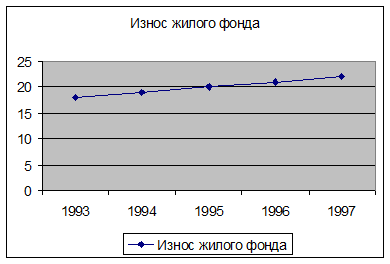 Ещё одна проблема – строительство жилищного фонда. Как видно из таблицы, его количество растёт очень медленно, а в 1997 году и вовсе не изменилось по сравнению с предыдущим, хотя по официальным данным на строительство жилых домов в этом году было выделено 203,2 миллиарда рублей. Возникает вопрос, куда всё-таки делись эти деньги. Пока на него ответа нет. Существующий фонд жилья, скорее всего, не удовлетворяет соответствующей потребности. Кроме того, жилищный фонд подвержен износу, и стареет медленно, но верно. Каждый год износ увеличивается на 1%. Строительство новых домов решит не только проблему обеспеченности жильём, но также и проблему старения жилищного фонда.