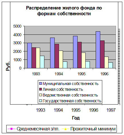 5. Распределение жилого фонда по формам собственности, изображённое на графике, как раз и послужило причиной того, что я выбрал демонополизацию фонда основным направлением реформы ЖКХ. На диаграмме видно, что количество личной собственности на квартиры значительно выросло, но одновременно с этим выросло и количество муниципального жилья. В итоге получилось, что в относительном выражении эти величины изменились не слишком существенно, и личная собственность составляет около 34%, муниципальная – около 45%. Итак, прослеживается тенденция к увеличению объёма и доли муниципальной и личной собственности на жильё, и снижению государственной и ведомственной.