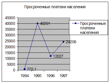 4. Не смотря на то, что среднемесячная зарплата превышает прожиточный минимум, можно видеть крупные суммы просроченных платежей населения по оплате жилищно-коммунальных услуг. Это говорит о том, что показатель прожиточного минимум слишком относителен и не даёт полной картины уровня жизни населения. Просроченные платежи составляют довольно крупные суммы, но максимальная сумма образовалась в 1995 году. С тех пор этот показатель существенно упал, но всё ещё продолжает достаточно быстро расти. Такая тенденция будет иметь негативное влияние на проведение реформы жилищно-коммунального хозяйства.