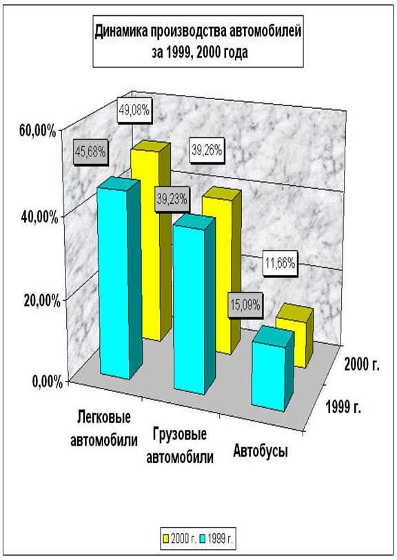 Підприємства автомобілебудування, що дісталися Україні в спадщину від розвинутого соціалізму (ЗАЗ, ЛуАЗ, ЛАЗ і КРАЗ), у 1999 році показали свою реальну життєздатність. Вони поступово нарощують свою частку в автовиробництві країни й досягли істотних успіхів. За 1999 рік частка традиційного автопрому зросла на 8% у виробництві легкових автомобілів, на 2% у вантажному автобудуванні, на 18% в автобусобудуванні. В умовах українського ринку ці підприємства змушені шукати нові економічні формули роботи і 2000 року став показником ефективності знайдених рішень. Крім того, тільки лише підприємства традиційної автопромисловості мають власну зовнішньоекономічну політику, тобто можуть поставляти автомобілі на експорт у ті країни, де такі автомобілі відповідають діючим стандартам. Більшість же складальних підприємств не можуть проводити власну експортну політику і змушені орієнтуватися тільки на український ринок. У першій половині 2001 року виробники України змогли зберегти темпи зростання виробництва автомобільної техніки. Так, частка легкових автомобілів в обсязі виробництва зросла на 1%, вантажних автомобілів збільшилася також на 1% і лише обсяг виробництва автобусів знизився на 2%. Спад виробництва автобусної техніки обумовлений кризою в області автобусних перевезень, що спричинило за собою скорочення виробництва на наступних підприємствах: “Черніговавтодеталь”, “Укрволгатехсервіс”, СП “IVECO-КрАЗ”, ЧАРЗ, “Автоагрегат” і “Оптіма”. У сформований обстановці тільки ЛАЗ і “Кримавтогаз” зумів зберегти обсяги випуску автобусної техніки.