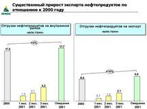 Имея достаточные объемы нефтепродуктов для выполнения своих обязательств и обеспечения потребителей внутри России, НК ЮКОС в 1-м квартале Компания активно наращивала экспорт нефтепродуктов. За 3 месяца он вырос на 56% (по сравнению с аналогичным периодом 2000 г.) при годовом плане роста - 18%. Началась подготовка первых долгосрочных контрактов по экспорту нефтепродуктов.