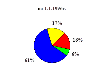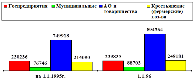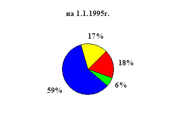 По сообщению Госкомстата РФ в 1995 году приватизировано более 10 тысяч, а с начала приватизации - более 122 тыс. При приватизации средних и крупных государственных предприятии сохраняется преобладание акционирования. В 1995 году было создано 2770 акционерных обществ, из них 77% - на предприятиях ранее бывших в федеральной собственности и собственности субъектов федерации. В созданных АО занято 1.8 млн человек. Суммарный уставный капитал - 583 млрд рублей. Стоимость имущества - 1707 млрд руб, 27% приходится на основные средства. (см. Приложение, График № 1).