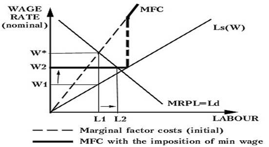 На графике, представленном выше, отображена ситуация монопсонии на рынке труда. Изначально, монопсонист нанимает то количество труда (L1), при котором кривая предельных издержек, связанных с ним (MFC) пересекается с кривой предельного дохода от нанимаемого труда, или, другими словами, кривой спроса на труд (MRPL=P*MPL=Ld). При этом, он устанавливает цену (W1) (именно устанавливает), равную предложению труда (Ls) при заданном L1. Мы видим, что и заработная плата и уровень занятого труда при этом меньше, чем установил бы совершенно конкурентный рынок труда. При последнем, уровень занятости и заработная плата определялись бы пересечением кривых предложения и спроса на труд. Таким образом, монопсонист искусственно занижает цену труда и нанимает при этом меньше рабочих. Если же правительство установит уровень минимальной заработной платы, то MFC для монопсониста при нём примет вид, показанный ломаной жирной линией. Это заставит нанимателя платить заработную плату W2 и нанимать при этом больше труда, а именно, L2. Конечно, легко показать, что это имеет место только если минимальная цена труда установлена эффективно, то есть, ниже некоего уровня W*. При установлении её выше этого уровня, количество нанимаемого труда на рынке упадёт по сравнению с изначальной ситуацией.