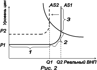 ), и если экономика находится на промежуточном (2) или классическом (3) отрезках кривой совокупного предложения, то это ведет к росту цен, что представляет инфляцию спроса.