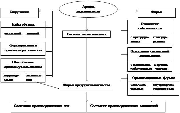 В отличие от чисто юридического определения аренды как договорного, срочного и возмездного владения и пользования имуществом, аренда – это система хозяйствования или организационная форма предпринимательства, выражающая отношения собственности и состояние производственных сил и прежде всего рабочей силы. Более наглядно это можно увидеть на схемах (см. схемы 1, 2 и 3).