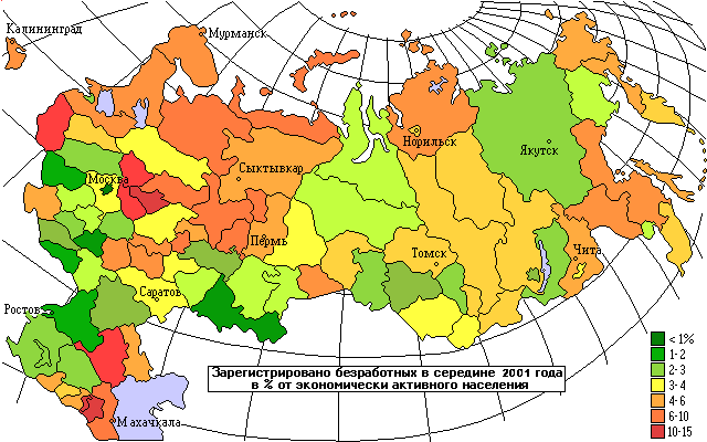 В соответствии с методикой МОТ, которой придерживается Госкомстат РФ, в марте 2001 года в России было 6,7 млн. безработных. По регионам зарегистрированная