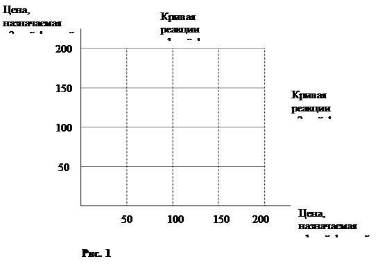 В крайнем случае, фирма 2 может запросить так много, что ее цена выведет ее из рынка, оставив первой фирме чистую монополию. В этом случае фирма 1 максимизирует прибыль, установив цену 150 долларов, что показывает прерванная кривая, называемая “монопольная цена фирмы 1”. Монопольная цена фирмы 2 показана таким же образом. Эти две кривые реакции могут определяться кривыми издержек двух фирм и кривыми спроса. Формирование их здесь не показано.
