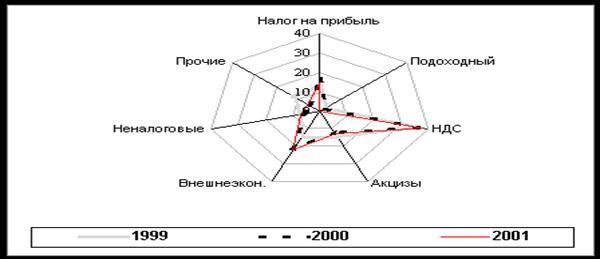 В структуре доходов федерального бюджета в январе-октябре 2001г. поступления от НДС составили 487,2 млрд. рублей, налогов на внешнюю торговлю и внешнеэкономические операции — 272,6 млрд., налога на прибыль предприятий — 174,4 млрд., акцизов — 159,5 млрд. Неналоговых доходов получено 87,2 млрд. рублей, доходов целевых бюджетных фондов — 11,9 млрд.