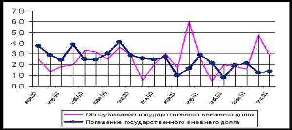Процентные платежи (по обслуживанию госдолга) в январе-октябре 2001г. сократились до 20,6% общей суммы расходов федерального бюджета, тогда как в январе-октябре 2000г. их доля составляла 21,5%, в январе-октябре 1999г. — 25,4%.
