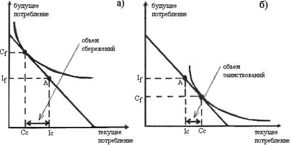 В зависимости от предпочтений, человек может сберегать часть текущего дохода (рисунок 5.3‑3а), или выступать в роли заемщика (рисунок 5.3‑3б).