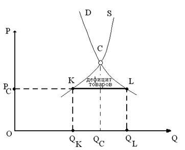 Равновесная цена, определяемая соотношением спроса и предложения в точке С, равна уровню PC. Государство устанавливает постоянные цены (PKL