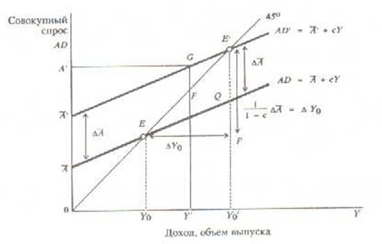 На рисунке дается графическая интерпретация воздействия прироста автономных расходов на равновесный уровень дохода. Первоначально равновесие достигалось в точке Е при уровне дохода Y0