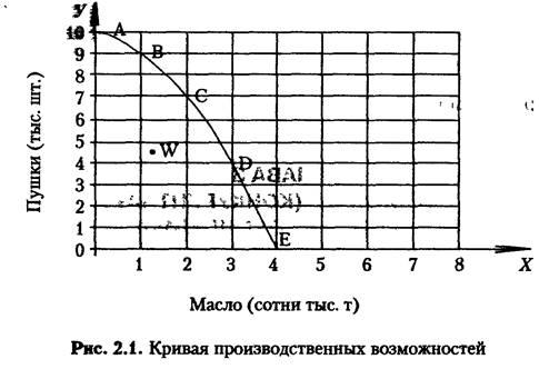 Из данного рисунка видно, что каждая точка на кривой производственных возможностей представляет какой-то максимальный объем производства двух продуктов. Ограниченность ресурсов не допускает какого-либо сочетания производства в точке W, расположенной вне кривой производственных возможностей. Именно в этом суть проблемы экономии.