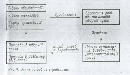 Основою зростаючого впливу процесу розвитку потреб на виробництво є підвищення ролі творчої праці та гуманізація виробництва, що є рисами постіндустріального виробництва. В свою чергу, зростаюча інтелектуалізація праці, впливаючи на формування потреб виробника, ставить відповідні вимоги перед виробництвом. Близько половини молодих американців (віком до 25 років) вважають творчий характер праці більш важливим стимулом, ніж рівень матеріальної винагороди. Цей процес можна представити схемою, наведеною на рис. 3.