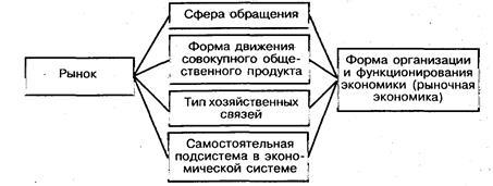 Таким образом, можно выделить еще одно понимание рынка – как общественной формы организации и функционирования экономики, прп которой обеспечивается взаимодействие производства и потребления без посреднических институтов, регулирующих деятельность .производителей и потребителей, прямое и обратное воздействие на производство и потребление. В.В.Герасименко пишет, что обмен товаров через рынок становится формой системы экономических отношений рыночной экономики и организация системы обмена товаров, ее институты, процесс этого обмена, его субъекты, сами товары, которые функционируют в рамках этой системы – все это приобретает имя рынка. Иногда рынок определяют как сферу купли-продажи товаров и услуг. Но сфера рынка не ограничивается только этими отношениями.