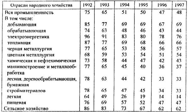 Индекс промышленного производства по России в 1997 г. составил 47,5% от уровня 1991 г., в том числе: в добывающих отраслях - 69%, в обрабатывающих - 44%, в машиностроении и металлообработке - 37%, в легкой промышленности - 14%, в пищевой - 47%, а в сельском хозяйстве - 62% (см. Приложение).