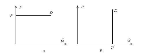 Существует два крайних случая. Первый случай — существование только одной цены, при которой товар будет приобретаться покупателями. Любое изменение цены приведет либо к полному отказу от приобретения данного товара (если цена повысится), либо к неограниченному увеличению спроса (если цена снизится). При этом спрос является абсолютно эластичным, показатель эластичности бесконечен. Графически этот случай можно изобразить в виде прямой, параллельной горизонтальной оси (рис. 2, а