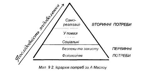 Перші дві групи потреб первинні, а наступні три вторинні. Відповідно до теорії Маслоу, усі ці потреби можна розташувати в строгій ієрархічній послідовності, у вигляді піраміди, в основі якої лежать первинні потреби, а вершиною є вторинні.