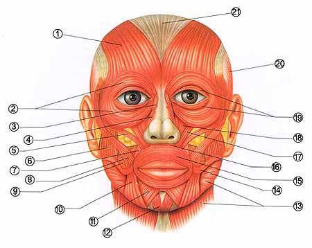 1 Лобная 2 Глазничная часть круговой мышцы глаза 3 Крыльная часть носовой мышцы 4 Поперечная часть носовой мышцы 5 Малая скуловая 6 Жевательная 7 Поднимающая угол рта 8 Большая скуловая 9 Щечная 10 Опускающая угол рта 11 Опускающая нижнюю губу 12 Подбородочная 13 Подкожная мышца шеи 14 Мышца смеха 15 Круговая мышца рта 16 Расширяющая ноздри 17 Поднимающая верхнюю губу 18 Подниматель верхней губы носовой мышцы 19 Вековая часть круговой мышцы глаза 20 Височная 21 Сухожильный шлем
