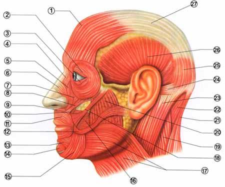 1 Лобная 2 Глазничная часть круговой мышцы глаза 3 Вековая часть круговой мышцы глаза 4 Крыльная часть носовой мышцы 5 Подниматель верхней губы носовой мышцы 6 Поперечная часть носовой мышцы 7 Поднимающая верхнюю губу 8 Малая скуловая 9 Расширяющая ноздри 10 Поднимающая угол рта 11 Круговая мышца рта 12 Мышца смеха 13 Опускающая нижнюю губу 14 Подбородочная 15 Опускающая угол рта 16 Щечная 17 Подкожная мышца шеи 18 Большая скуловая 19 Ременная мышца головы 20 Жевательная 21 Трапецивидная 22 Полуостистая мышца головы 23 Грудинно-ключичнососцевидная 24 Задняя ушная 25 Затылочная 26 Височная 27 Сухожильный шлем