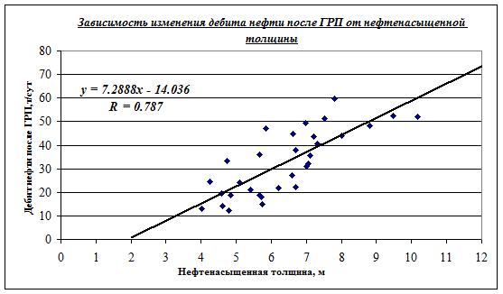коэффициент корреляции R - 0,787.Рис.3. Зависимость изменения дебита нефти после ГРП от нефтенасыщенной толщины.