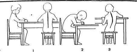 должна позволять ребенку свободно, без поднимания или опускания плеч, класть предплечья на крышку стола. При слишком большой дифференции ребенок, работая за столом, поднимает плечи, особенно правое, при слишком малой—он сгибается, сутулится (рис. 2).