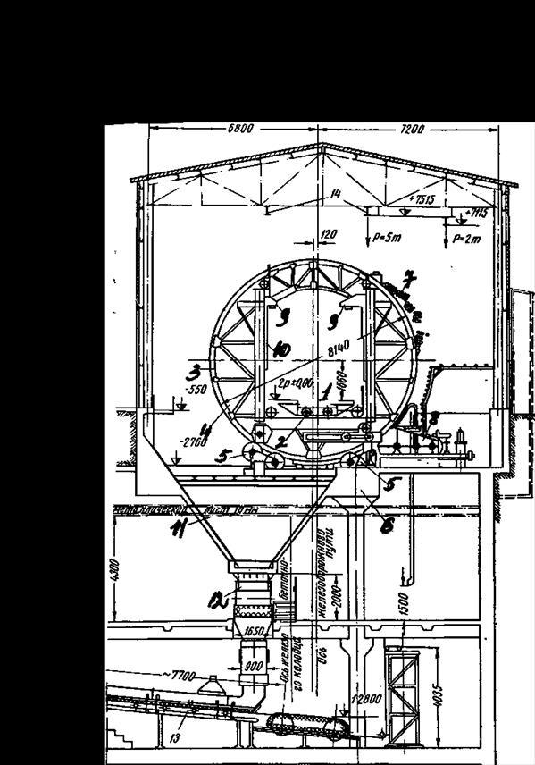 Склад состоит из типовых секций по восемь бункеров. Поэтому при привязке типового проекта к определенному заводу количество бункеров следует брать кратным восьми. Диаметр бункера 13 м,