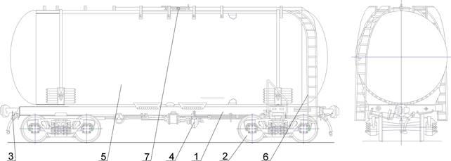 Цистерна (рис.1) состоит из: рамы 1, ходовой части 2, ударно-тяговых приборов 3, тормозного оборудования 4, котла 5, лестницы 6, устройств загрузки и выгрузки 7.