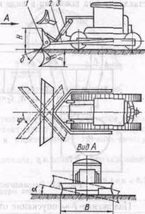 (рис. 8.6) представляет собой гусеничный или колесный тягач (базовая машина) с навесным оборудованием, имеющим рабочий орган в виде отвала /, соединенного с толкающими брусьями 2.