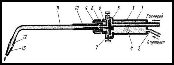 1 — кислородный ниппель; 2 — ацетиленовый ниппель; 3 — рукоятка; 4 — кислородная трубка; 5 — вентиль для кислорода; 6 — корпус; 7 — вентиль для ацетилена; 8 — инжектор; 9 — накидная гайка; 10 — смесительная камера; 11 — наконечник; 12 — соединительный ниппель; 13 — мундштук
