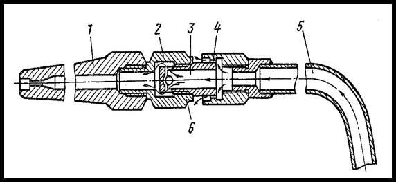1 — мундштук; 2 — подогревающая камера; 3 — подогреватель; 4 — сопла подогревателя; 5 — трубка горючей смеси; 6 — подогревающие пламена.