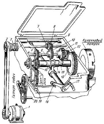 Главный привод станка. В передней бабке размещены коробка скоростей и шпиндель, которые приводят во вращение обрабатываемую деталь при выбранных глубине резания и подаче. На рисунке показано устройство коробки скоростей, которая работает следующим образом. Заготовка зажимается в кулачковом патроне, который крепится к фланцу шпинделя 13. Вращение от электродвигателя 1 через ременную передачу 2 и муфту включения 3 передается на вал 5.