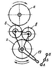 Привод этого механизма осуществляется от коробки скоростей через трензель (смотри рисунок справа), который состоит из четырех зубчатых колес а, б, в, г, связанных с рукояткой 19, переключением которой осуществляется реверс (т. е. изменение направления вращения) вала 20 (приводного вала суппорта). Позиции а, б, в, г, 19 и 20 (см. рисунки). При крайнем нижнем положении рукоятки 19 (положение А) зубчатые колеса а, б, в, г соединены последовательно и направление вращения вала 20 совпадает с направлением вращения шпинделя. При верхнем положении рукоятки 19 (положение В) соединены только зубчатые колеса а, в, г и направление вращения вала 20 изменяется на противоположное. В среднем положении рукоятки 19 (положение Б) зубчатые колеса б и в не соединяются с зубчатым колесом а и вал 20 не вращается.
