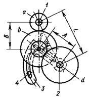 С помощью гитары (сотри рисунок слева) устанавливают (настраивают) зубчатые колеса с определенным передаточным отношением, обеспечивающим необходимое перемещение суппорта на один оборот шпинделя. Расстояние L между валами 1 и 2 является постоянным. На валу 2 свободно установлен приклон 3 гитары, закрепленный болтом 4. Ось 5 промежуточных колес вис можно перемещать по радиальному пазу, тем самым изменяя расстояние А между центрами колес c и d. Дуговой паз приклона 3 позволяет регулировать размер В.