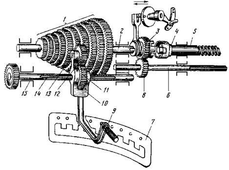 Коробка подач. Назначение коробки подач - изменять скорости вращения ходового винта и ходового вала, чем достигается перемещение суппорта с выбранной скоростью в продольном и поперечном направлениях. Вал 14 в подшипниках 15 (сотри рисунок) коробки подач получает вращение от зубчатых колес гитары; вместе с ним вращается и имеет возможность перемещаться вдоль него зубчатое колесо П с рычагом 10. На одном конце рычага 10 вращается (на оси) зубчатое колесо 12, сопряженное с зубчатым колесом 11, а на другом - рукоятка 9, с помощью которой рычаг 10 перемещается вдоль вала 14 и может занимать любое из десяти положений (по числу зубчатых колес в механизме 1 Нортона). В каждом из таких положений рычаг 10 поворачивается и удерживается штифтом 9, который входит в соответствующие отверстия на передней стенке 7 коробки подач. При этом зубчатое колесо 12 входит в зацепление с соответствующим зубчатым колесом 13 механизма 1, в результате чего устанавливается выбранное число оборотов вала 2. Вместе с валом 2 вращается зубчатое колесо 3, которое можно перемещать вдоль него рукояткой. При перемещении вправо зубчатое колесо 3 посредством кулачковой муфты 4 соединяется с ходовым винтом 5 и передает ему вращательное движение, а при перемещении влево - входит в зацепление с зубчатым колесом 8 и передает вращательное движение ходовому валу 6.