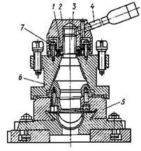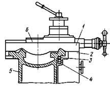Устройство резцедержателя показано на рисунке слева. В центрирующей расточке верхних салазок 5 установлена коническая оправка 3 с резьбовым концом. На конусе оправки установлена четырехсторонняя резцовая головка 6. При вращении рукоятки 4 головка 2 перемещается вниз по резьбе конической оправки 3 и через шайбу 1 и упорный подшипник обеспечивает жесткую посадку резцовой головки 6 на конической поверхности оправки 3. От поворота при закреплении резцовая головка удерживается шариком, который заклинивается между поверхностями, образованными пазом на основании конической оправки 3 и отверстием в резцовой головке 6. При необходимости сменить позицию инструмента рукоятку 4 поворачивают против часовой стрелки. При этом головка 2 поворачивается и перемещается вверх по резьбе конической оправки 3, снимая усилие затяжки резцовой головки 6 на конусе конической оправки 3. Одновременно головка 2 поворачивает резцовую головку 6 посредством тормозных колодок, фрикционно связанных с поверхностью расточки головки 2 и соединенных с резцовой головкой 6 штифтами 7. При этом шарик, расположенный у основания конической оправки 3, не препятствует повороту резцовой головки, так как он утапливается в отверстие, сжимая пружину. Если в процессе работы рукоятка 4 (в зажатом положении) стала останавливаться в неудобном положении, то, изменяя толщину шайбы 1, можно установить ее в удобное для рабочего положение.