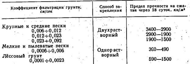 Однорастворный способ силикатизации используют и для закрепления лёссовых просадочных грунтов, имеющих коэффициент фильтрации от 0,0001 до 0,0023 см/сек. При этом в грунт нагнетают раствор одного жидкого стекла. Гелеобразование происходит за счет реакции раствора жидкого стекла с водорастворимыми солями грунта и его обменным комплексом. Роль второго раствора выполняет сам грунт. Прочность закрепленного грунта приведена в табл. 1.