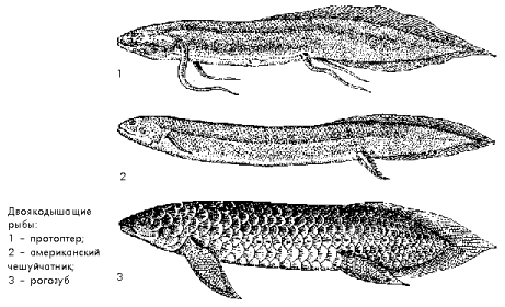 Двоякодышащие рыбы – очень древняя группа. Их остатки находят в отложениях девонского периода палеозойской эры. В течение долгого времени двоякодышащие были известны только по таким окаменелым остаткам, и только в 1835 г. было установлено, что обитающий в Африке протоптер – двоякодышащая рыба. Всего же, как оказалось, до наших дней дожили представители шести видов этой группы: австралийский рогозуб из отряда однолегочных, американский чешуйчатник – представитель отряда двулегочных и четыре вида африканского рода Protopterus, также из отряда двулегочных. Все они, как, видимо, и их предки, пресноводные рыбы.